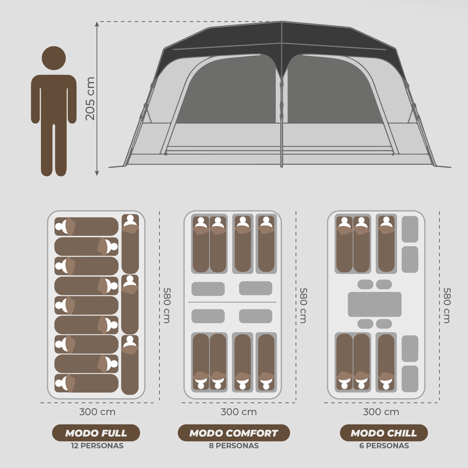 Vive el camping sin complicaciones. La Carpa Automática Lauca para 12 personas es todo lo que necesitas: se arma en 3-6 minutos, tiene una impermeabilidad de 3000 mm y resistencia comprobada al viento y la lluvia. Su interior es amplio, con buena altura para moverte con comodidad, y su sistema de ventilación mantiene el ambiente fresco y sin condensación. Incluye detalles prácticos como pared divisoria, pasacables para electricidad, gancho para iluminación y bolsillos organizadores. Liviana, resistente y lista para acompañarte en cualquier salida de tres estaciones.