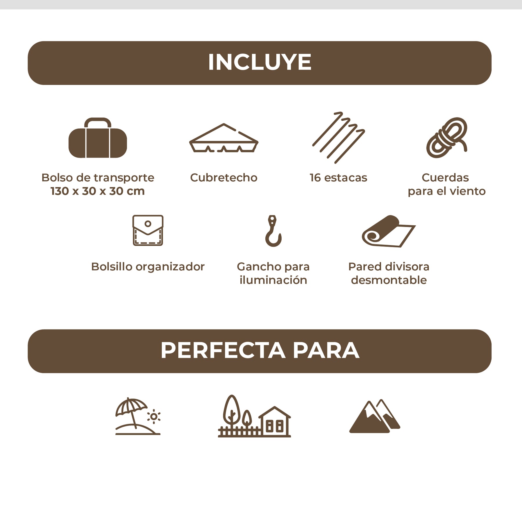 Practicidad: - 2 grandes puertas de entrada con mosquitero. - Pared divisoria desmontable para separar los ambientes a gusto. - Agujeros pasacables para conectar corriente eléctrica. - Gancho para iluminación. - Ventanas en sus 4 lados con cierre y mosquitero para mayor flujo de aire. - Bolsillo organizador para objetos pequeños. - Incluye: 6 sogas para el viento, cubretecho impermeable, bolso de transporte, 16 estacas.
