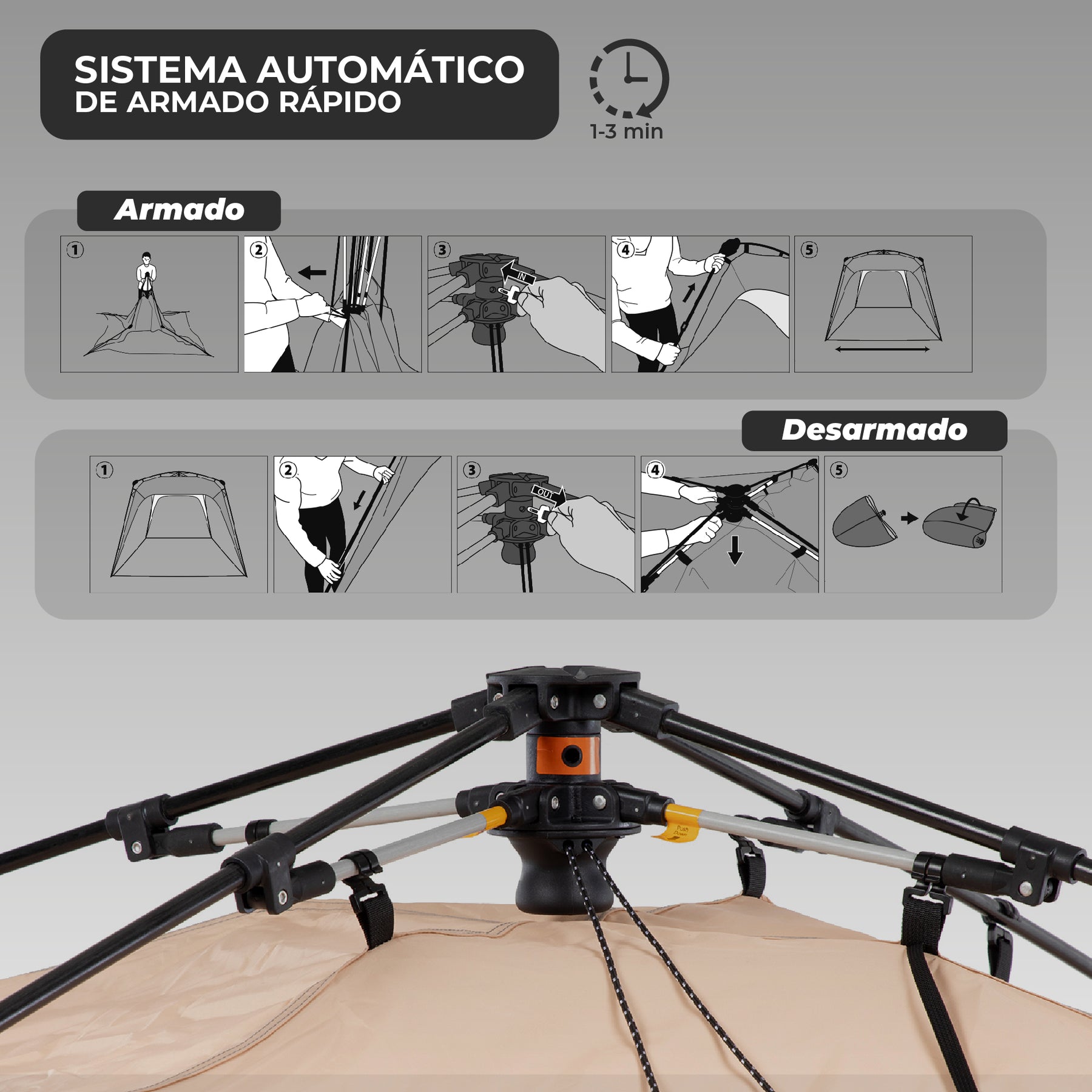 Sistema de armado automático: se despliega en segundos, sin esfuerzo ni herramientas.